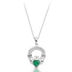 Claddagh Pendant with a heart shaped Emerald stone in the centre surrounded by a halo of stones. This contemporary Claddagh Pendant clasps a beautiful synthetic Ruby gemstone. An elegant 18″ chain is included with this pendant. Feel your Irish roots as you wear this sturdy Silver Claddagh Pendant made in Ireland by Claddagh Jeweler enriched with Micro Pave setting Cubic Zirconia and synthetic Emerald set in place of the heart.Â