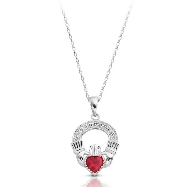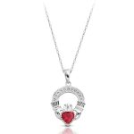 Claddagh Pendant with a heart shaped Ruby stone in the centre surrounded by a halo of stones. This contemporary Claddagh Pendant clasps a beautiful synthetic Ruby gemstone. An elegant 18″ chain is included with this pendant. Feel your Irish roots as you wear this sturdy Silver Claddagh Pendant made in Ireland by Claddagh Jeweler enriched with Micro Pave setting Cubic Zirconia and synthetic Ruby set in place of the heart.Â