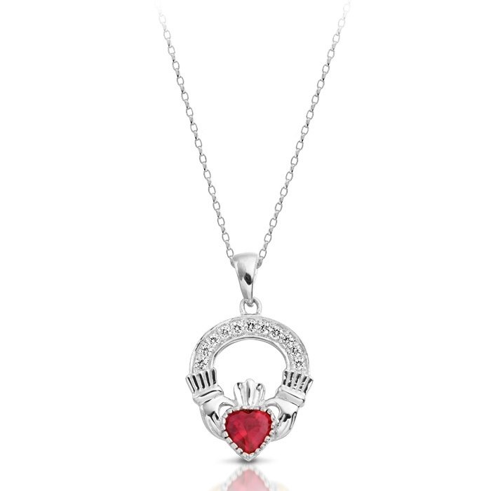Claddagh Pendant with a heart shaped Ruby stone in the centre surrounded by a halo of stones. This contemporary Claddagh Pendant clasps a beautiful synthetic Ruby gemstone. An elegant 18″ chain is included with this pendant. Feel your Irish roots as you wear this sturdy Silver Claddagh Pendant made in Ireland by Claddagh Jeweler enriched with Micro Pave setting Cubic Zirconia and synthetic Ruby set in place of the heart.Â