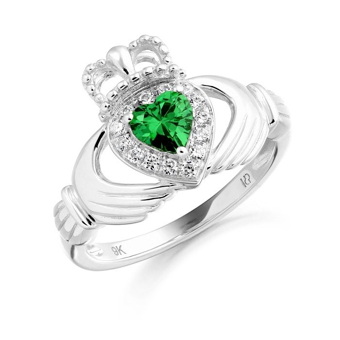 This Claddagh Ring with Cubic Zirconia is crafted from Silver in Ireland by Irish Jeweler and Rhodium plated for mirror shine. This Claddagh Ring is complete with a CZ Emerald in place of the heart of the claddagh surrounded by cubic zirconia with most complex Micro Pave stone setting by hand which is the most up to date & difficult setting to achieve highest level of finish and help stones shine truly , and to add extra beauty & outstanding smooth detailed finish with Millgarain Crown enhances the concept further & draws eyes to attention to detail with opulent look and feel.