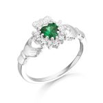 With beautiful detailing this Silver Claddagh Ring has a synthetic Emerald stone set as Heart surrounded by Cubic Zirconia stones to decorate the concept to bring out the beauty & sparkle in Claddagh Ring. One can’t help but adore the beautiful Irish craftsmanship., this Ladies Cubic Zirconia Claddagh Ring is crafted from 925 Sterling Silver by Claddagh Jeweler in Ireland.