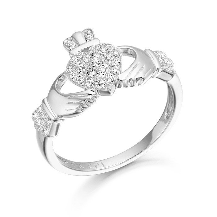 A line of sparkling accent stones surround the puffed  heart in this classic Claddagh Ring and is Irelandâs everlasting commemoration of friendship, loyalty, and love. Our ladies Claddagh Ring pays attention to details, style and craftsmanship which makes this Claddagh Ring stylish, unique and timeless piece of Irish Jewelry.